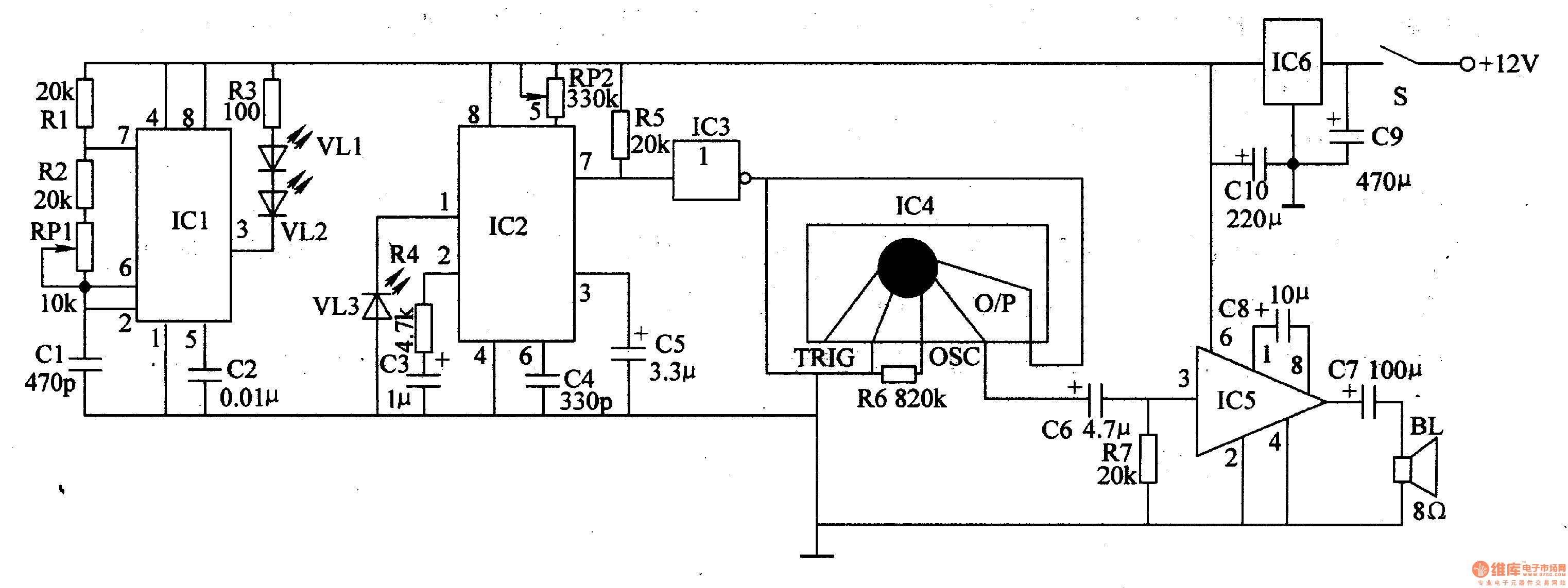 The power supply circuit consists of ignite switch circuit, 3-phase regulated circuit IC6 and filter capacitors of C9 and C10. The infrared emitter consists of the relay R3, infrared LED of VL1 and VL2 and the 40khz multi-resonance oscillator circuit. The oscillator consists of the time-based integrated circuit IC1, resistors of R1 and R2, potentiometer RP1 and capacitors of C1 and C2