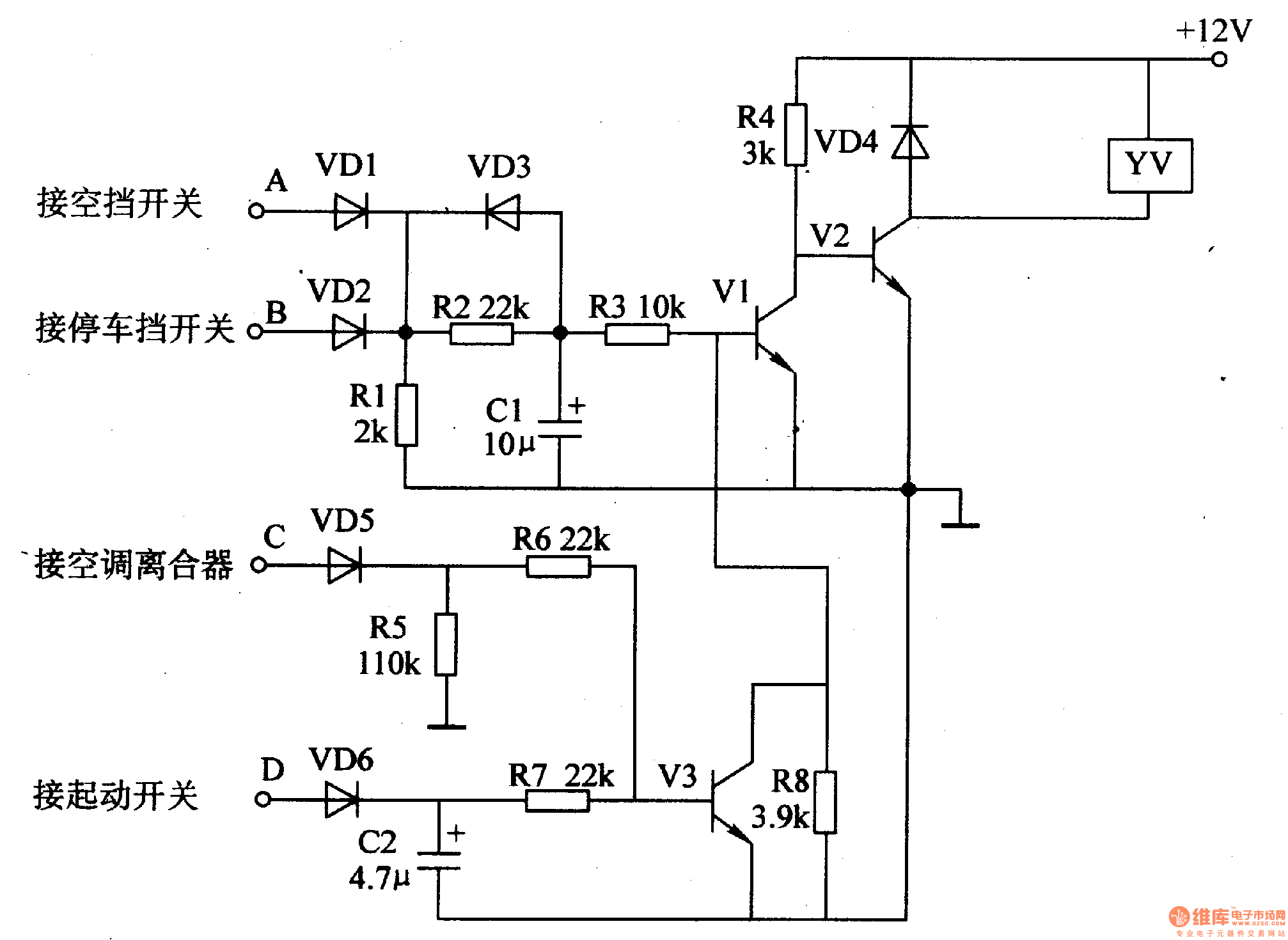 The car electronic fuel-saving device is composed of the diodes VD1-VD6, the resistors R1-R8, the capacitors C1 and C2, the transistors V1-V3 and the electromagnetic valve YV, the circuit is as shown in figure 7-140.