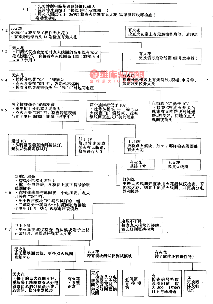 Both the high voltage wires of *1 and *2 should be checked to make sure that the wire of spark piston is connecting. If sparks come out when EST plug(wire 4) is being pull off, that means the output voltage of signal picking coil is too low to make EST work. If *3 has sparks, that means the problem is in electricity distributor and spark distributor. When the *4 is in normal condition, there should be battery voltage on both terminals c and + of igniting module, and the voltage is tend to be low, that mean there are breaks or resistance value is too high between distributor and igniting coil or switch.