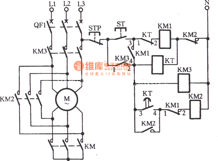 The circuit makes sure that there is enough time when Y-△ decompression is started, i.e in the KM2 coil control circuit, the 2 couples of serial contactors make sure there is enough time when Y-△ decompression is started.