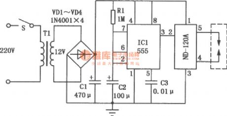 The ozone is a strong oxidizer.It has the ability to sterilize,bleach,deodorize and oxygenate.The specific circuit of the effective ozone generator is shown as the chart.The power transformer outputs +12V voltage time-base provides power supply to the integrated circuit 555 and ozone generater component ND-120A after it is commutated.IC1,R1 and C2 made up the monostable oscillator.You can adjust the value of R1 and C2 to change the oscillation frequency of IC1.The pin③ outputs oscillation impulse after IC1 oscillates.It stimulates ozone components.Then the pin④ and pin⑤ drive the ozone chips directly.The circuit can generate 100~150mg ozone every hour.It could be used in the place with low ozone density.