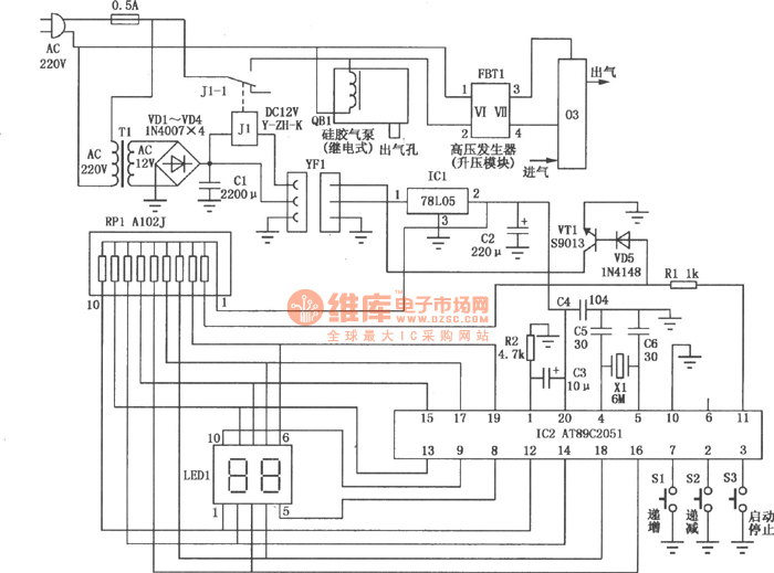 The fruits and vegetables detoxification machine uses ozone to do the sterilization and degradation on the pesticides remainings in fruits and vegetables.The circuit is made up of power supply circuit,electronic timer, relay-driven circuit,air pump,high voltage generator and ozone generator.The AC220V commercial power gives power supply to the air pump and high voltage generator.It is reduced by T1,commutated by VD1~VD4,filtered by C1.Then it generates about 12V DC voltage for the use of relay-driven circuit.The 12V voltage is regulated by KA78L05 through IC1.Then it forms 5V steady voltage for electronic timer circuit.