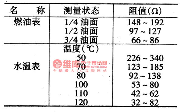The H7 signal of engine rotating speed comes from the junior negative point of the igniting coil(connecting to igniting module); both the oil meter(H9) sensor and oil alarm switch are fixed in the oil tank, when the oil drops the minimum, the alarm lamp (E45) is on, but the car can run another 50KM. The water temperature meter(H8) and oil tank (H) share a stabilizer whose output voltage is 10V. The sensor parameters of these two meters are seen in Figure 6. One terminal of the electrooptical indicator(E36) connects to F13(No.15 wire), and the other connects with the juncture of the generator diode and the field coil.