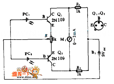 In order to adjust the brightness of two light sources for the same, you can use this circuit as the light comparison standard. PC1 and PC2 are the solar cells. At the beginning, if you want to make the electric bridge in balance, the two solar cellsare irradiated by the same light source, and it uses the R to adjust the zero-point to make the reading points to the center of the zero meter.