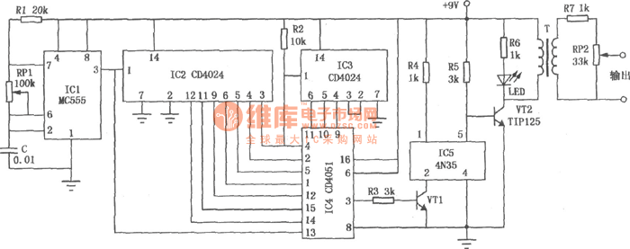 The multifunction physiotherapy circuit is shown as the chart.Its electrical stimulation pulse frequency could increase(or decrease) from 2 to 256Hz.Every frequency it could last 8s.It transforms automaticly.It works in cycle.