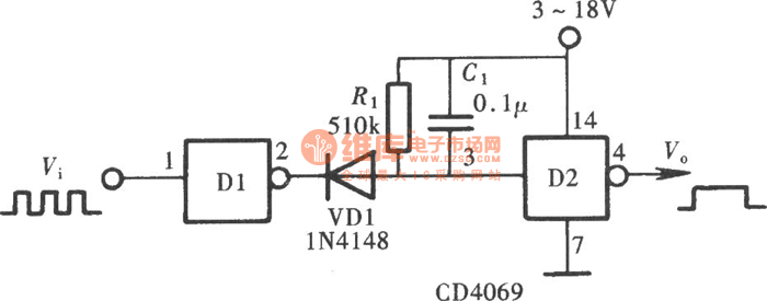 The pulse demodulator composed of CMOS six intervers CD4069 is seen as the chart.It is used to envelope detect for the plulse demodulator.