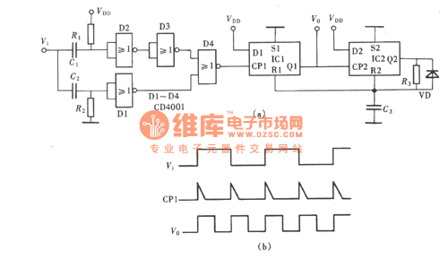 With a CD4013 and a 4-1-2 input terminal NOR gate CD4001, we can make a pulse doublefrequency circuit, whose circuit is shown in the figure.