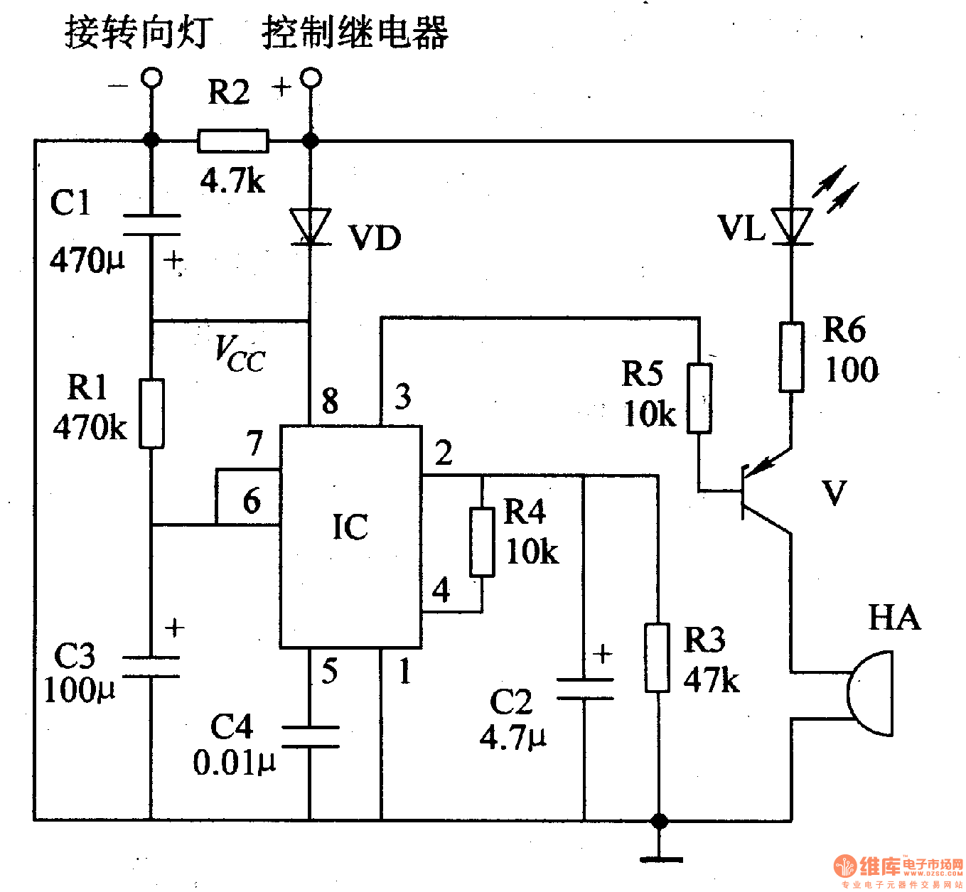 Here is to introduce the steering lamp shutting reminder made of the 555 time based integrated circuit, which can emit the alarm signal when the driver forgets to shut off the steering lamp, so the driver will shut the lamp.The working principle of the circuit The steering lamp shutting reminder consists of the time-based integrated circuit IC, transistor V, diode VD, LED VL, resistor R1-R6, capacitor C1-C4 and buzzer HA, see as figure 7-118.