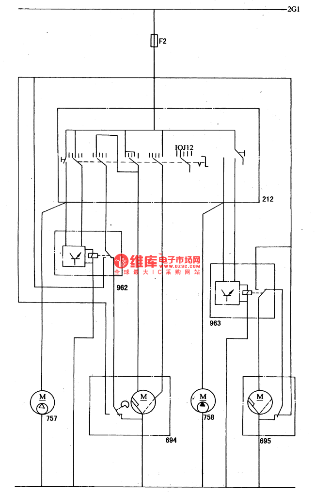 When the igniting switch(300) is normally working, the wire of 2G1 will link to the switch of 212. (Including the fusebox FZ), there are 5 gears in the switch. In the frontend of the marked position in the figure, 1 means stepper gear( single step work ), 0 means stopping working, J means interrupted wiping. The interval relay(962) controlled circuit works when it links to the power supply fire wire, and the wiper motor(694) was controlled by the switch of 212; the interval motor(962) terminal is designed to connect with the fire wire, and the motor wipe 1-2 times at a low speed, then keep still for 6-8s, and wipe again 1-2 times, then keep still for 6-8s```