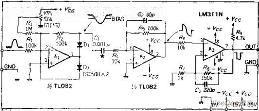 Circuit slightly is offset. Remove the noise of the input signal to make the circuit to avoid the error action.OP amplifier A1 is the ideal half-wave detector circuit.It outputs reverse signal, this signal is added to the differential circuit A2, and do the differential, and then seeks the zero-crossing time.Doing the zero-cross detection with comparator A3, the rising edge of the output pulse is the peak time. If the input waveformisthe same, there is nothing with its magnitude, only do zero-cross detection of the differential coefficient. Differential capacitor is 0.001UF, the input signal frequency range is about 100HZ ~ 10KHZ, if the input signal frequency is outside of this range, C1's capacity should be changed accordingly.
