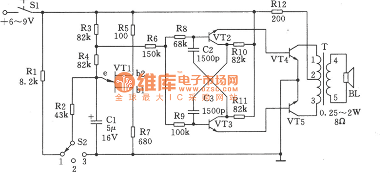 Variable-tone signal generating circuit can be used in making different types of alarms, and can also in toys which will bring about a lot of fun. As seen in the figure, this circuit comprises relaxation oscillatory composed of unijunction transistor VT1, multivibrator composed of VT2, VT3, and B-type push pull power amplifier composed of VT4, VT5. The selection of component is as follows.