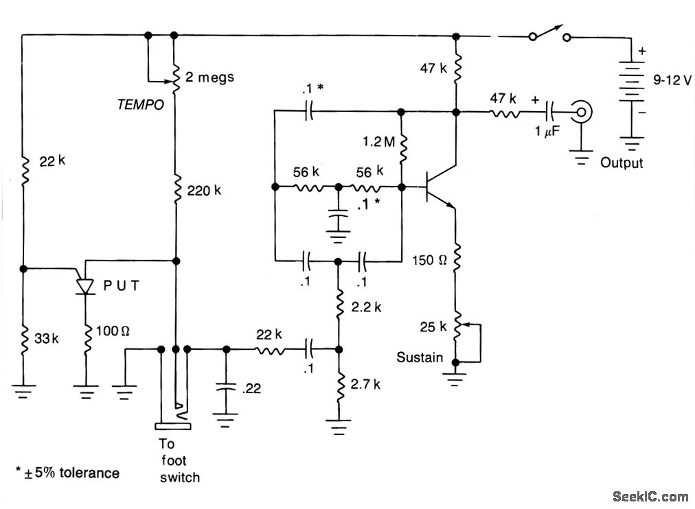 This unit generates a drum-like damped oscillation that sounds best when fed into a higher power amplifier. The beat rate may be determined by operating a foot pedal in much the same manner as for a real drum, or by means of an internal oscillator, the speed of which may be preset.