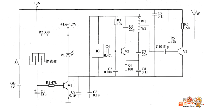 When the animals have babies,the resistence between two crossed electrodes of the comb-like sensor become small.V1 is saturated to conduct.VL is lighted.The +3V voltage is current limited by R2.It is connected with VL and V2 in series.And it is regulated by them.Then it provides IC and the high frequency oscillator (consists of R3,R3,C4~C8,L1 and V2) 1.6~1.7V DC working voltage.IC outputs the acoustics signal.It is modulated by the high frequency oscillator.And it is power amplified by V2.Then it is emitted by antennas W to the sky.The feeder can recieve the alarm signal of having animal babies by FM in a distance.