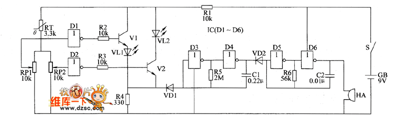When the temperature is beyond the upper limit of the set temperature,the temperature of RT is decreased.The neutral pointpotential of RP1 is increased.D1 outputs low level.V1 is conducted.VL1 is lighted.It indicates the temperature beyond the upper limit.At the same time,VD1 is stopped.The 1Hz low-frequency oscillator and the 1kHz audiofrequency oscillator start to work.The 1Hz low-frequency oscillator modulates the 1kHz audiofrequency oscillator.HA gives out alam sound every now and then.When the temperature is lower than the lower limit of the set temperature,the resistence of RT is increased.The neutral point potential of RP2 is decreased.D2 outputs high level.1/2 is conducted.VL2 is lighted.It indicates the temperature is lower than the lower limit.At the same time,the 1Hz low-frequency oscillator and the 1kHz audiofrequency oscillator starts to work.HA give out alarm sound.