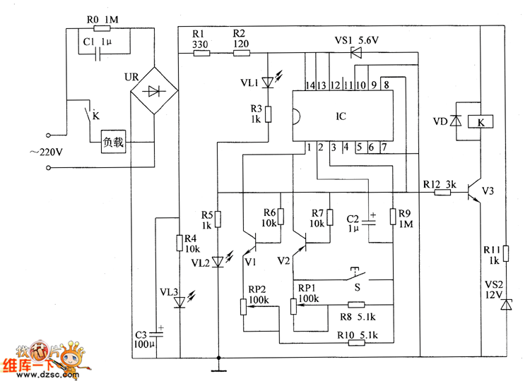 When the power-supply is turned on,the AC 220V voltage is reduced by C1.It is commutated by UR.After it is filtered by C3,it branched into 3 parts.One part is current limited by R11.It is regulated by VS1.It provides 12V working voltage for relay K.One part is current limited by R1 and R2.It is regulated by VS2,it provides +5.6V working voltage for IC.The last part light VL3 through Ⅲ.After IC is conducted to work,the 8th-pin outputs low level.It lights VL2.It stops VI and Y3.V2 is conducted.K can't be pulled in. The load is not working.VL1 is lighted.You can adjust the resistance of RP1.Or you can change the capacity of C2.You can set up the time of the load whenit ispower down(the range of adjusting is 5-120min).