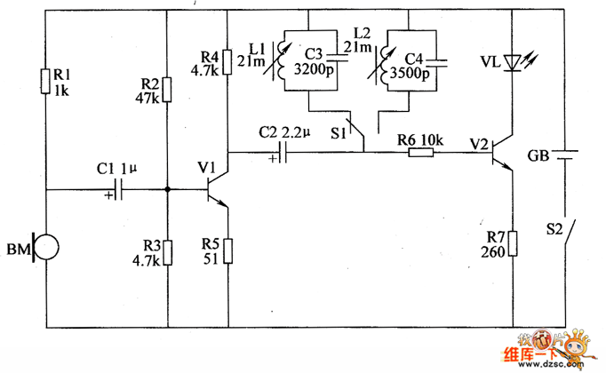 When the mains switch gets through,every circuit of the whole machine is conducted to work.The microphone BM converts the recieved sound signal of the chickling into the electric signal.It is amplified by V2.Then it goes into the selective amplifier which consists of selective circuit and LED drived circuit.Then it is selected and amplified.When S1 is pressed,the 4.8kHz selective circuit works.When S1 isn't pressed,5.2kHz selective circuit works.If VL doesn't lighted when S1 is pressed.Then VL is lighted if S1 is not pressed.It imforms the chickling is hen.