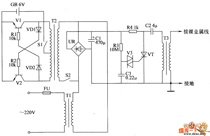 When DC current power-supply is adopted,S1 and S2 get through.The self-exciting multivibrator works.It turns 6V DC voltage to the swing of 60V square-wave voltage by T2.The square wave voltage is commutated by UR and it is filtered by C1.It charges C3 and C2 by R3 and R4.When the voltage of C3 reaches the break over voltage of DIAC V3.V3 is conducted.C3 discharges the gate of thyristor VT by V3.It triggers VT to conduct.After VT is conducted,the electric charge stored on C2 discharges quickly by VT and T3.It generates pulse high voltage on the secondary winding of T3.