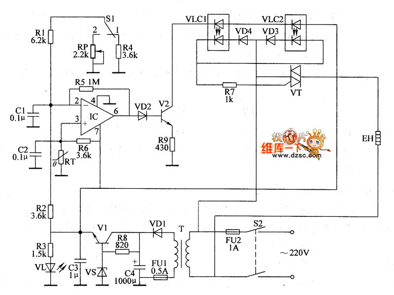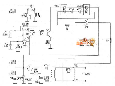 When the mains switch S2 gets through,the 220V AC voltage is reduced by T,commutated by VD1,filtered by C4,regulated by V1 and V2.It provides +12V working voltage for IC and VLC2.At the same time,it lights VL by R3.When the power supply is on,the temperature in the hatching house is lower than the set temperature.The resistence of the temperature sensor RT is large.The pin-6 of IC(output end) outputs high level as the voltage of pin-3(the non-inverting termina) is higher than the voltage of pin-2(the inverting termina).V2 is conducted.The LEDs in YLC1 and YLC2 are lighted. The photodiode is conducted.VT is triggered to conduct.The electric heater EH is conducted to work.