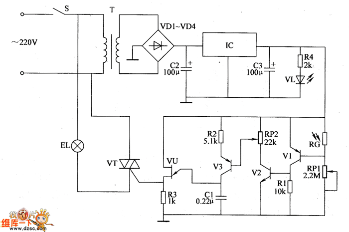 The 220V AC voltage is reduced by T,commutated by VD1~VD4,filtered by C2 and regulated IC.Then it becomes +9V voltage.It is the working power supply for the photometry circuit and the dimming circuit.At the same time,VL is lighted by R4.When in the daytime,the resistence of RC is low.V1~V3,VU and VT are stopped.EL isn't lighted.When in the cloudy and rainy day,the resistence of RC increases.V1~V3,VU and VT are all conducted.EL is lighted.The dimmer the light,the stronger the electric current,the faster of the C1's charging speed.The trigger pulse generated by VU increases the conduction angle of VT.And the brightness of EL becomes stronger.