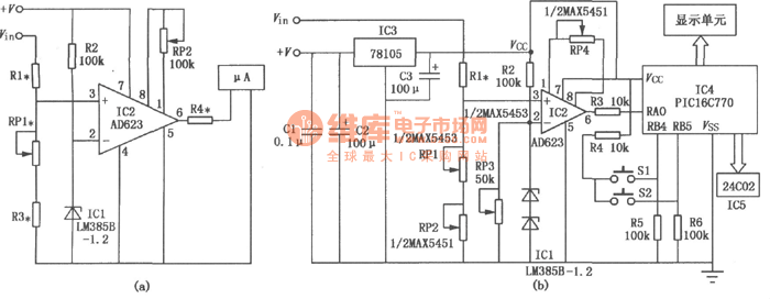 The circuit adopts the amplifier and high precision components.It improves the performance of the region voltmeter greatly.The inverting input of IC2 meter amplifier AD623 uses the high precision voltmeter reference IC1 as a standard.The noninverting input ends R1,RP1 and R3 enlarge the voltmeter to be measured.RP1 is the zero potentiometer .RP2 is the gain adjustment potentiometer.The amplifier output end is enlarged by the branched resistance R4.Then it connects the table head with the starting value and the termination value.You can select a region of voltmeter Vin to be measured.The starting value is V1.The termination value is V2.The voltmeter Vin to be measured changes within the range of V1~V2.