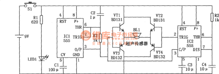 The circuit of the machine which used to drive cats and dogs is seen as the chart.It emits high-power ultrasonic which is safe to human beings.In this way,themachine reaches its goal to threat and drive cats and dogs .And it can keep them away.