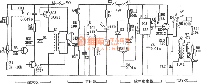 You can plug two electrodes in CK1.The oscillation frequency becomes higher as the resistance of the points is low.When the distance between the points and the detectors becomes farther,the frequency becomes lower.In this way it is to reach the points detection.The timer is made up by ICl(555),R5,W2 and C3.The pulse generator is the multivibrator composed of W4,R8,D3,D4,W3 and C4.The oscillation frequency is f=1.44/(Rw4+R8+Rw3)C4.You can adjust the potentiometer W3 and W4 to change the oscillation frequency and duty ratio.
