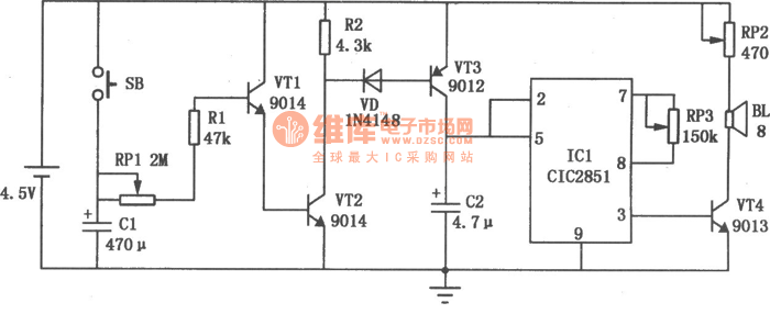 When the switch button SB gets through,C1 is charging.VT1 and VT2 are conducted.When SB is disconnected,VT1 and VT2 could stay conducted as C1 discharges to VT1 by RP1 and R1.VT3 is conducted because it gains forward biased current from polar c and e of VT2 through diode VD.IC1 works.The pin③ outputs music signal.The signal is amplified by VT4,then it drives the horn to give out a sound.The horn will play the music on and on in certain time as the pin② of IC1's trigger end connects to the positive electrode.In this way,it reaches the goal of hypnosis.The playing speed is adjusted by RP3.