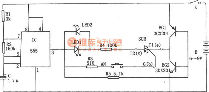 The oscillation frequency shown in the chart is about 1Hz.The charging time t of the capacitor C =0.693(R1+R2)C.The discharge time t of the capocitor C =0.693R2C.They are quite alike.So the duty cycle of the output pulses is near 1:1. LED1,resistor R4,SCR,transistor BG2 form a closed circuit when 555 outputs high level as AN is pressed and SCR is plugged in.LED1 gives out light.LED2,R4,SCR and BG1 form a closed circuit when 555 outputs low level.LED2 gives out light.It indicates the SCR is good.