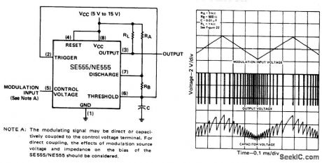 If the timer is triggered with a continuous pulse train in the monostabie mode of operation, the charge time of the capacitor can be varied by changing the control voltage at pin 3.In this manner, the output pulse width can be modulated by applying a modulating signal that controls the threshold voltage. (View)