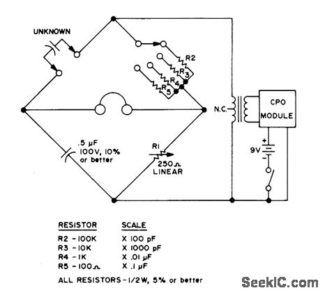 SimpIe bridge uses AF voltage from Cordover CPO-4 code practice oscillator module, fed through transistor output transformer connected in reverse for impedance matching. Earphones serve as null detector, but amplifier can be added for greater sensitivity or CRO used. Only one scale need be calibrated, using known values of capacitors.-W. P. Tumer, Build a Basic Bridge, 73Magazine, Nov. 1974, p 95.