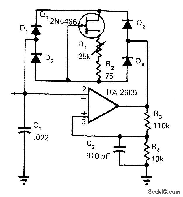 Diode bridge and FET form constant-current source charging c1,to make voltage across c1 change at linear rate as required for triangle output across c1. Frequenεy can be adjusted from 500 Hz to above 20 kHz with constant output amρlitude, by means of R1 Short -term stabilityis better than1 partin l0.000 Since the same R and C are used to generate both sections of the waveform,ρositive and negative slopes are identical,Diodesare HP 5082-2810.-G. R. Begaulg, oρ AmρMakes Variable-Frequency Tliangular Wave Generator,EDN Magazine, Sept 15,1972,ρ 42-43.