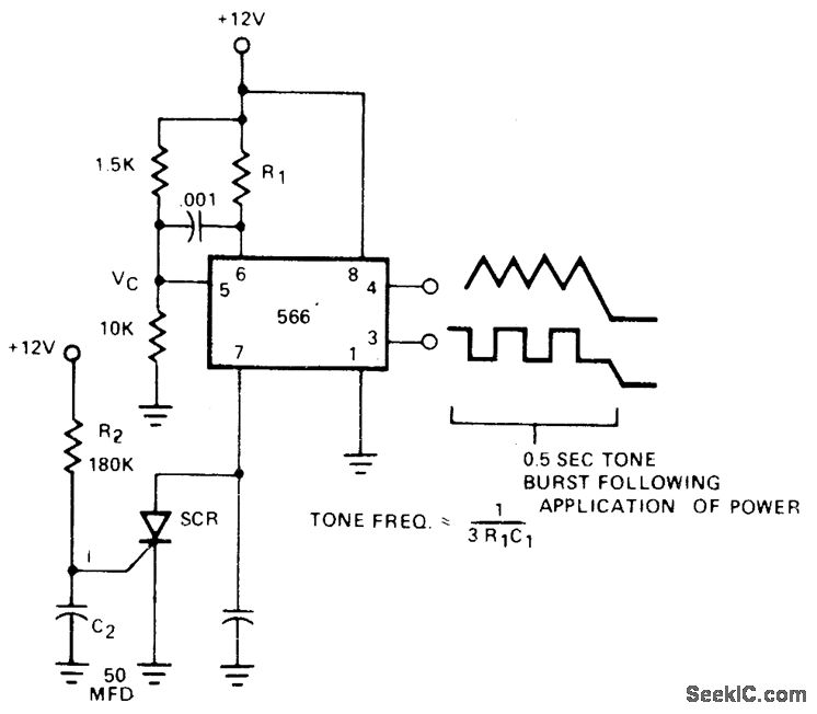 Simple 566 function generator circuit supplies audio tone for 0.5 s after power is applied, for use as communication-network alert signal. SCR is gated on when C2 charges up to its gate voltage, which takes 0.5 s, to shunt timing capacitor between pin 7 and ground and thereby stop tone. If SCR is replaced by NPN transistor, tone can be switched on and off manually at transistor base terminaL- Signetics Analog Data Manual, Signetics, Sunnyvale, CA, 1977, p 852-853.