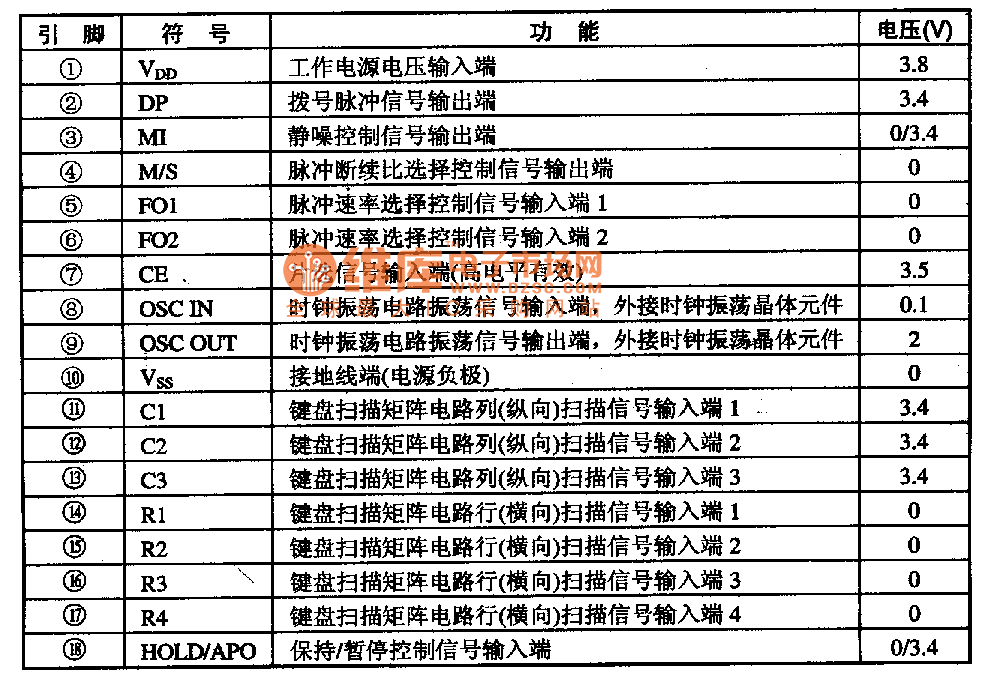 0M1032 integrated circuit contains dialing signal processing circuit, static noise control circuit, key switch encode and decode circuit. The IC adopts 18-pin DIP structure, the pin function and data is shown as the table.