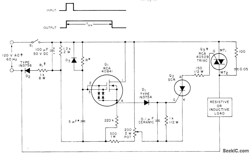 Value of resistor R controls duration of time delay provided by RCA 40841 dual-gate FET in SCR trigger circuit, with SCR in tum serving to triggertriacfor handling highcurrent resistive or inductive AC loads. Maximum delay of 5 min is obtained when R is 60 megohms (IRC type CGH or equivalent resistor). Timing is accurate within 10% over temperature rangeof -25℃to +60℃. D3 should be rated 60 V Use any SCR capable of handling triactrigger current,rated 60 V.- Linear Integrated Circuitsand MOS/FET,s, RCA Solid State Division,Somerville,NJ,1977,p435-437.