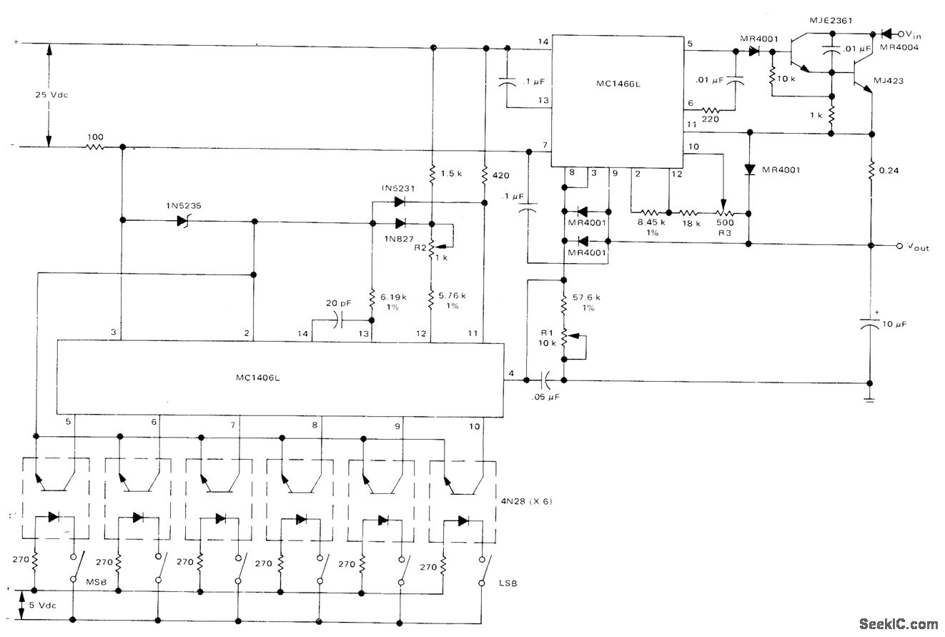 High-voltage digitally controlled power supply uses Motorola MC1406L 6-bit DAC and MC1466L floating voltage regulator to deliver up to 1 A of load current over output voltage that can be incremented in 63 steps of 1 V each, Digital word that controls voltage is coupled into DAC with 4N28 optoisolators. Current-amplifier output stage using Darlington connection of transistors is designed to operate from +70 V supply. -D. Aidridge and N. Wellenstein, Designing Digitally-Controlled Power Supplies, Motorola, Phoenix, AZ, 1975, AN-703, p 6.