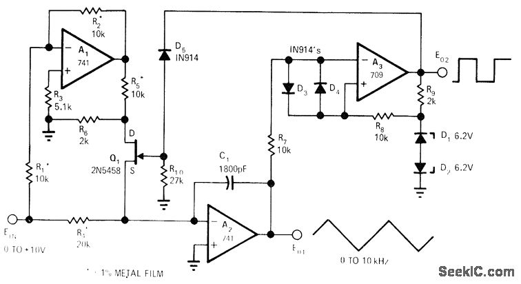 Circuit provides good stability and excellent linearity over wide operating range. For values shown and +15 V supply, circuit transfer function is about t kHz/ V over 100:1 frequency range, with linearity error less than 0.5%. Although circuit does not have sine-wave output, triangle output is easily converted to sine wave by filtering to remove harmonics. Article traces circuit operation.-G. Bank, A Wideband, Linear VCO, EDN/EEE Magazine, July 15, 1971, p 49-50.