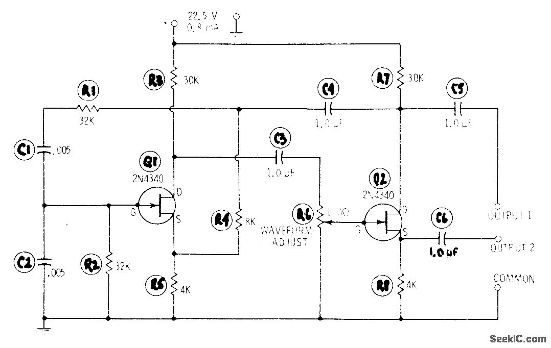 Simple RC-tuned oscillator uses only two resistors (R1 and R2) and two capacitors (C1 and C2) to set frequency.Feedback path covers both FET stages. Set R6 for best sine-wave output. For other audio frequencies, change value of R in ohms and C in farads in equation f = 1 /6.28RC where frequency is in hertz, R = R1 = R2, and C = C1 = C2.-R. P. Turner, FET Circuits, Howard W. Sams, Indianapolis, lN, 1977, 2nd Ed., p 48-50.