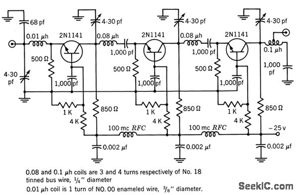 Uses mismatch design technique to obtain desired overall gain of 37.5 db at bandwidth of 9 Mc for three cascaded stages.-Texas Instruments Inc., Transistor Circuit Design, McGraw-Hill, N.Y.,1963,p 290.