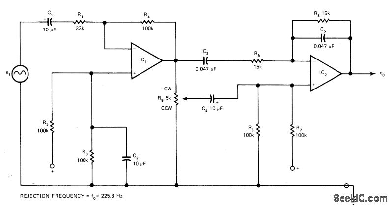 Opamp serves as active element in voltage-controlled voltage-source second-order filter. Other opamps having required high input resistance, low input current, and high speed are 1556 and 8007.-W. G. Jung, IC Op-Amp Cookbook, Howard W. Sams, Indianapolis, IN, 1974, p 331-333.