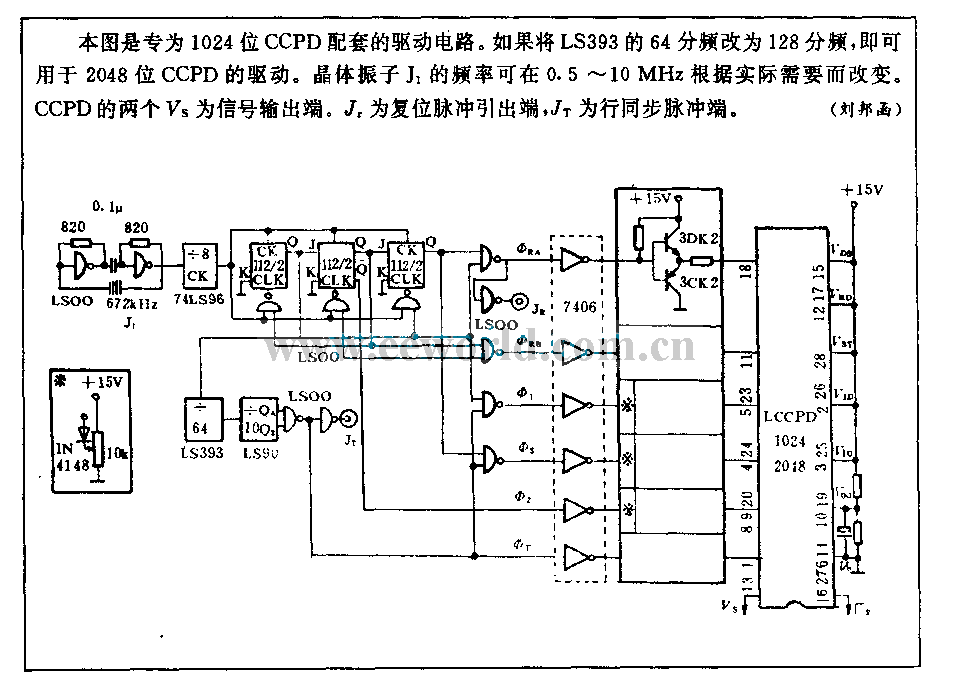 The diagram is drive circuit which is support to 1024 bit CCPD. It can used for drive of 1024 bit CCPD if change 64 frequency division of LS393 to 128 frequency division. The frequency of quartz crystal unit J1 can change according to actual need at the range of 0.5~10MHz. Two Vs of CCPD is signal output end. Jr is reset pulse exit side. JT is line synchronizing pulse side.