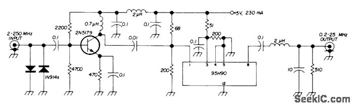 Used to increase range of frequency counter. Sensitivity is 20 mV at 175 MHz, 40 mV at 220 MHz, and 90 mV at 250 MHz.Fairchild IC is used. Simple L-section filter at output rolls off frequencies above 30 MHz, allowing sealer to be used up to 250 MHz without erroneous counting of second or third harmonics of squarewave output of scaler if counter in use will respond to 60 MHz or more.-E. Guerri, Frequency Pre-Scaler, Ham Radio, Feb. 1973, p 57.
