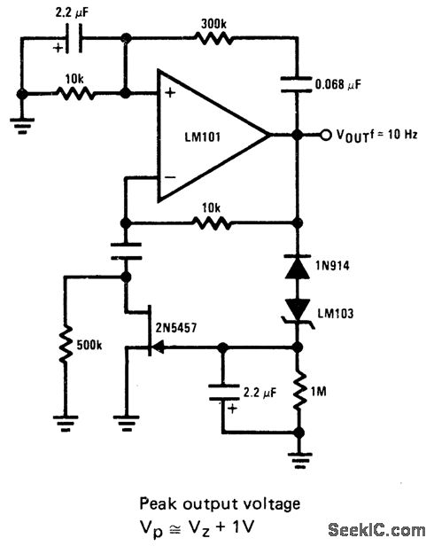 JFET serves as voltage-variable resistor in feedback loop of opamp. as required for producing low-distortion constant amplitude sine wave LM 103 zener providrs voltage for peak amplitude of sine wave this voltage is rectified and fed to gate of JFET to vary its channel resistance and loop gain of opamp.- FET Databook, National Semiconductor. Santa Clara. CA. 1977. p 6-26-6-63