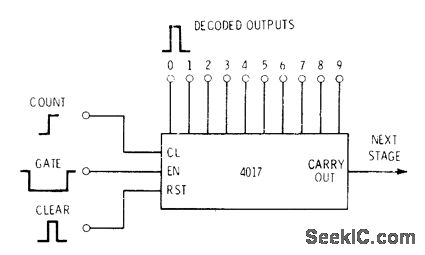 4017 divide-by-10 counter routes input clock signal sequentially to each of ten output lines, with only selected output going high. Intemal circuit of IC is self-clearing walking ring that is glitch-free, with minimum overlap between outputs. Counters can be cascaded to provide more steps. -D. Lancaster, CM0S Cookbook. Howard W. Sams, Indianapolis, IN, 1977, p 309.