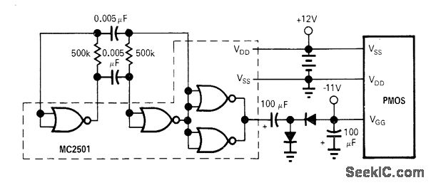 Bipolar inverter and rectifier together provide -11 V from 12-V auto battery for operating high-threshold MOS logic of portable or automotive equipment.Diode types are not critical. Inverter draws only about 1 mA from 12.V battery on standby and supplies 2 mA from -11V terminal.—B. Fette, Inexpensive Inverters Generate VGG for Portable MOS Applications, EDN|EEE Magazine, Dec. 15, 1971,p 51.