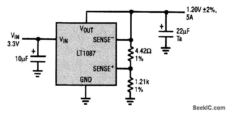 A recent development in high-speed digital design has resulted in a new family of logic chips called gunning transition Logic (GTL). These chips use high-speed logic and require active termination for best interconnection performance. The termination voltage required is 1.2 V, and the input voltage can be as low as 3.3 V from a logic supply. The LT1087 5-A low-dropout regulator shown here addresses these requirements by providing a regulated 1.2-V ±2 percent output voltage from a minimum 2.7-V input. Note that the LT1087 has a 1.25-V reference, but provides Kelvin sensing inputs for the feedback amplifier. The 4.42-Ω resistor is inserted as a simple way to adjust the internal reference downward without sacrificing regulation. This GTL termination circuit supplies 5 A maximum load current and can handle 3.3-, 5-V, or higher supplies, although 3.3 V is recommended for minimum device dissipation.