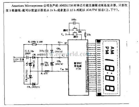AMIS1736 clock chip is produced by American Microsystems company. It can drive LCD directly. The display equipment can display 24h or display 12h coupled with AM/PM mark (Mornings And Afternoons) if only we we change three connections.