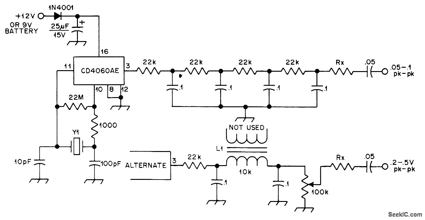 Uses 2.235-MHz crystal with counter chip to produce 136.5-Hz subaudible tone for amateur transmitter. Low-frequency square-wave output of IC is put through multistage low-pass filter to develop sine wave. Tone should be introduced into transmitter just after audio processing (after deviation control). AIternate filter is also shown; use whichever gives best performance, For other tone frequency, use crystal that is 16,384 times frequency desired.-E. Gellender and M. Marcel, P/L Tone Generator, QST, Aug. 1976. p 43.