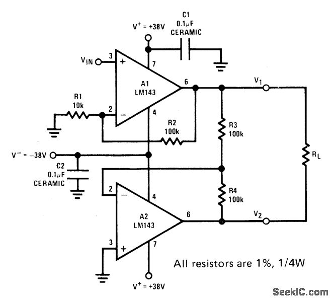 Two LM143 high-voltage opamps operating from 38-V supply can provide up to 138 V P-P undipped into 10K floating Ioad when connected as shown to give noninverting voltage amplifier followed by unity-gaininverter. Power supplies should be bypassed to ground with 0.1-μF capacitors. - Linear Applications, Vol. 2. National Semiconductor, Santa Clara. CA. 1976. AN-127. p 1-3.