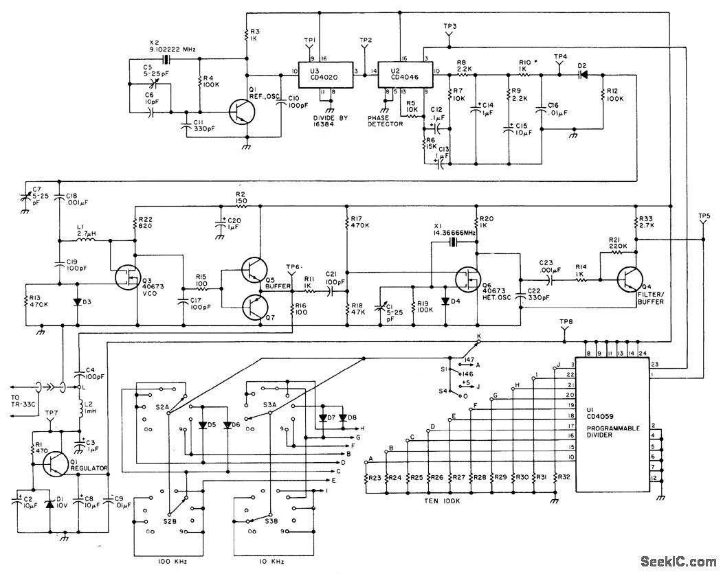 Designed for use with Drake TR-33C transceiver Circuit has built-in offset providing choice of any 5-kHz-spaced channel in frequency range for transmit and receive frequencies. Only two crystals are required. Desired frequency can be entered with BCD thumbwheel switches. Tuneup and testing procedures are given. D1 is 1N5530, D2 is 1N5144, and other diodes can be 1N914 or equivalent. Unmarked bipolar transistors are fast-switching silicon types; NPNs can be 2N2222, and PNPs can be 2N4403.-J. Moell, Super Deluxing the TR-33, 73 Magazine, April 1978, p 72-74.