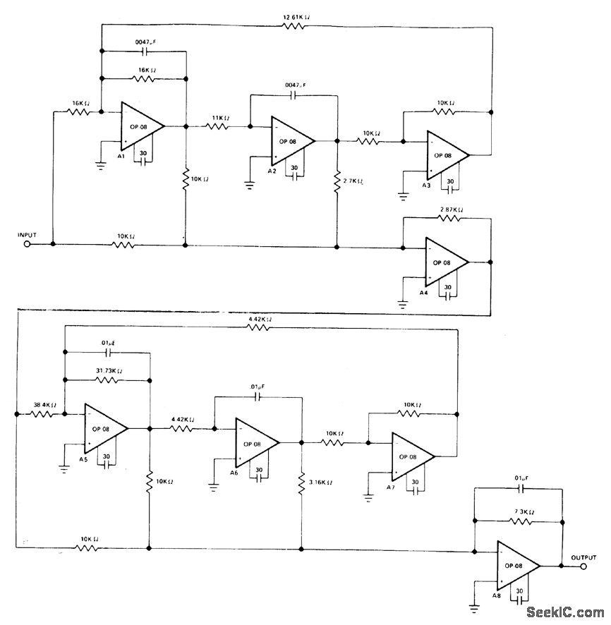 Five-pole telecommunication filter using eight Precision Monolithics op-08 opamps provides better than 30-dB attenuation in stop band.Total supply drain is only 4.8 mA for±15 V supply.- Precision Low Input Current Op Amp, Preoision Monolithics, Santa Clara, CA,1978,OP-08,p 6.